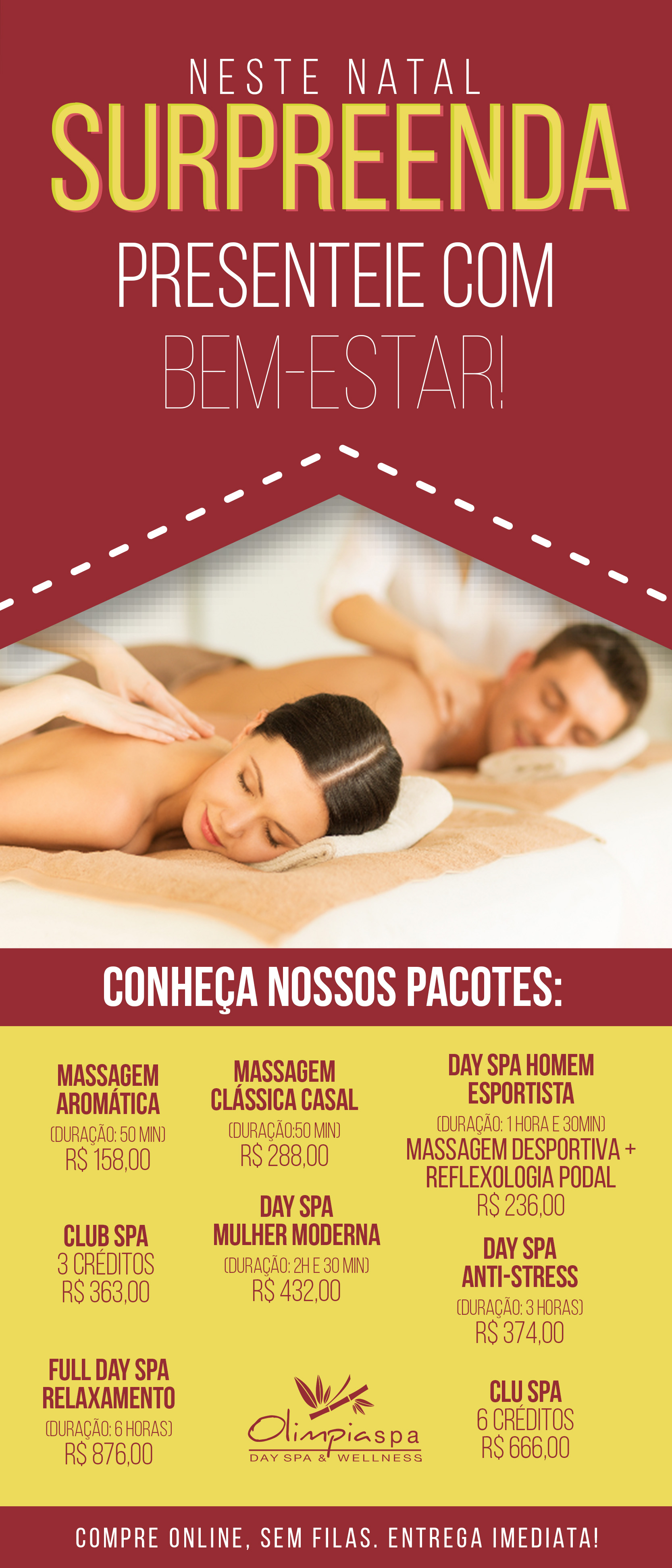 Sabemos que em época de Natal, costumamos deixar tudo para em cima da hora ou estamos na correria do dia a dia, então, poupar tempo também é válido. Aqui no Olimpia Spa, você pode comprar o voucher até on line e receber por e-mail ou no conforto da sua casa.