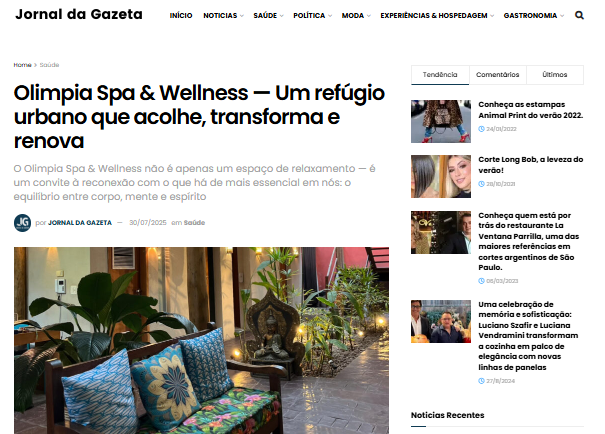 Saímos no jornal da gazeta: “Em meio ao ritmo frenético da capital paulista, há um santuário onde o tempo desacelera, a mente silencia e o corpo reencontra o seu eixo. O Olimpia Spa & Wellness não é apenas um espaço de relaxamento — é um convite à reconexão com o que há de mais essencial em nós: o equilíbrio entre corpo, mente e espírito.